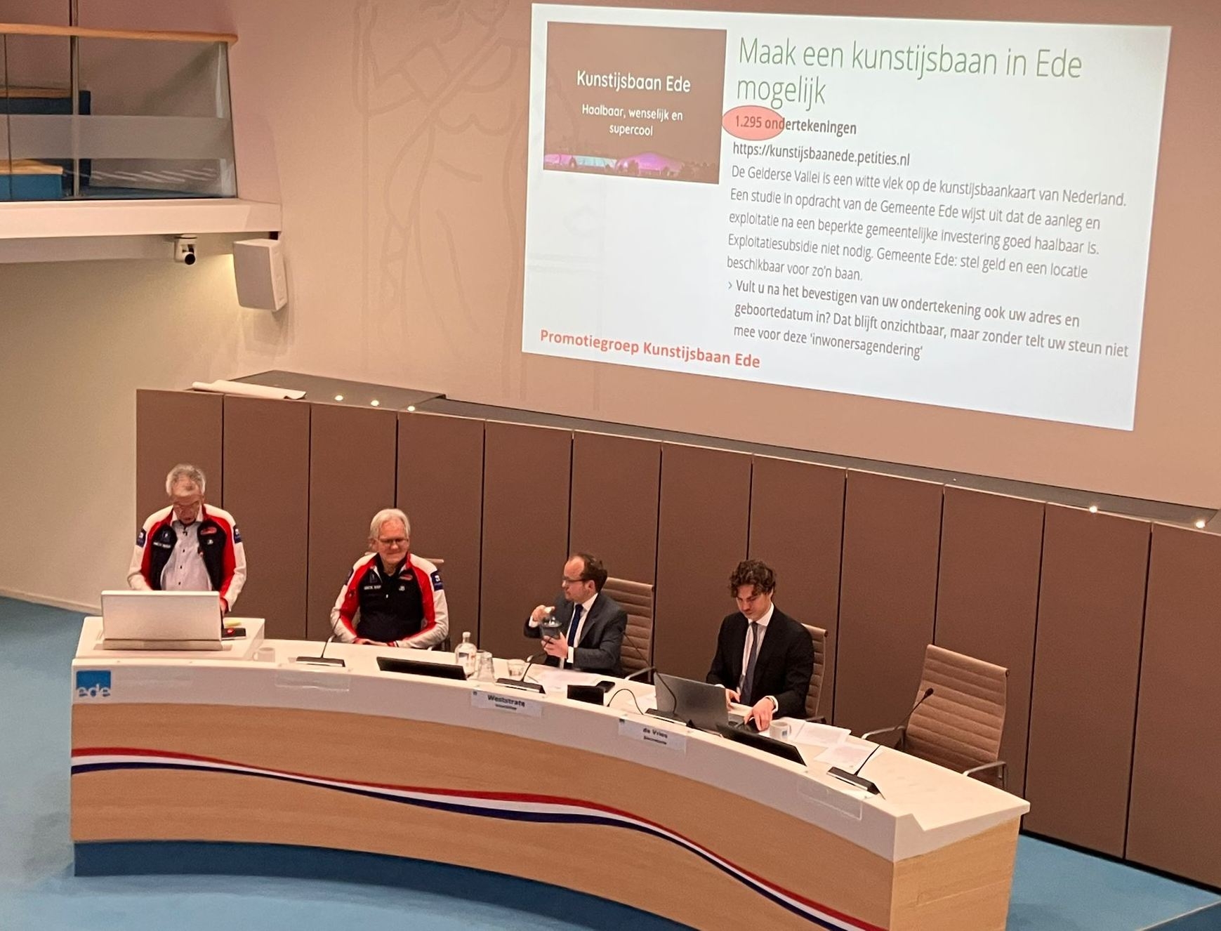 Een groot aantal raadsleden en een groot aantal enthousiaste schaatsliefhebbers uit Ede was bij de aanbieding aanwezig. 1261 mensen hebben de petitie ondertekend waarin aan de Gemeente gevraagd wordt om snel een kunstijsbaan te realiseren en het onderwerp nu eindelijk eens serieus in de Raad te bespreken.