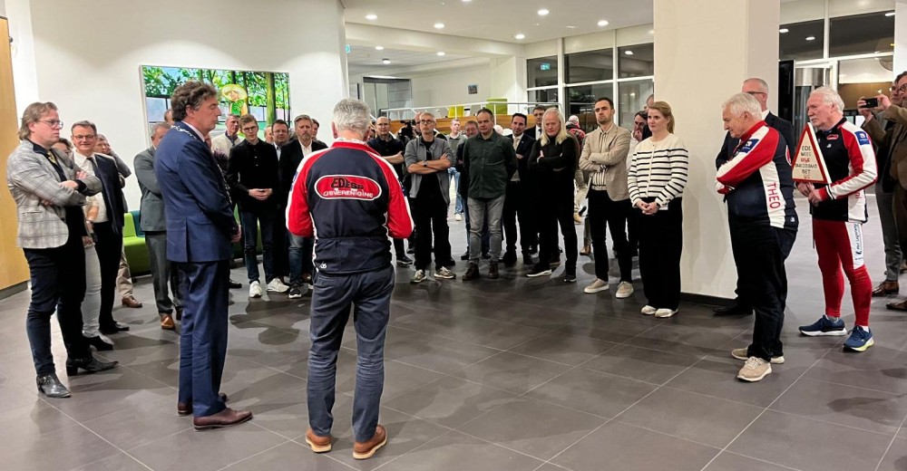 Een flink aantal raadsleden en schaatsliefhebbers is bij de aanbieding aanwezig